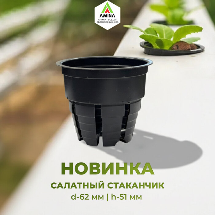 Вы просили — мы сделали! Amina Sauda с радостью представляет инновацию в ассортименте своей продукции — термоформованный салатный стаканчик диаметром 62 мм и высотой 51 мм, специально разработанный для выращивания салата и других зеленных культур методом проточной гидропоники.